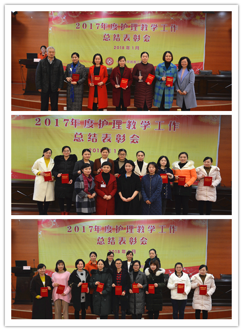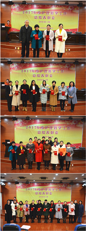 护理教研室主任毛平进行了临床护理教学年度工作报告,她从2017年护理教学重点工作及常规工作完成情况、科研与获奖情况进行总结;并对2018年教研室在教学管理、师资培训、临床实习管理、护士规范化培训、专科护理实习五个方面的计划与实施方案进行了阐述。护理部主任丁四清宣读表彰决定:肾内科十病区、急诊儿科、普外科三十四病区、妇科二十一病区、骨科二十六病区五个科室评选为“优秀护理教学单元”;龙琪(十九病区)等20位老师被评选为“优秀带教老师”;黄柯、付冰、曾佳等30位老师获护理教学技能竞赛获奖项。与会领导为获奖科室和个人颁发荣誉证书并合影留念。