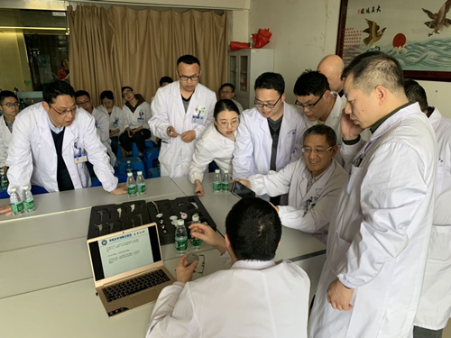 首先,吴松教授结合假体模型就目前人工髋关节假体的组件、类型、适应症以及手术要点进行了详细的讲解,让参加培训人员对THA有一个基本的了解。随后,曹力教授进行了远程THA视频直播演示,并与在场的骨科医师进行了关于THA手术细节的深入交流。吴松教授和沈民仁副教授随着手术视频的进程对在场参会人员进行了相关手术讲解,并对THA患者的治疗及护理要点进行了讲授,并对学生的提问进行了详细解答,让参加培训的人员均受益匪浅。