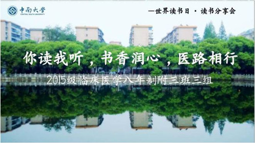 2019年4月23日是世界读书日,今年国家图书馆、中国图书馆学会、学习强国平台联合全国图书馆界,将开展以“读经典、学新知、链接美好生活”为主题的读书日系列活动。为了响应此号召,并迎接第24个世界读书日的到来,4月18日晚,中南大学湘雅三医院内科教研室王芳老师组织并带领2015级临床医学(八年制)附三大班三组的同学开展了“你读我听,书香润心,医路相行”——世界读书日·•读书分享活动。