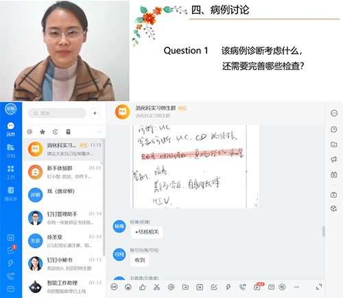 在授课前期,消化内科的带教老师们按照培养要求,在科主任王晓艳教授指导下制定了详细的教学计划,经过严格备课、预讲,最终确定线上授课内容为消化内科的常见病、多发病——腹水查因和腹痛查因。两位老师充分利用网络资源,使用钉钉软件实现视频会议功能,与同学们一起展开在线讨论。