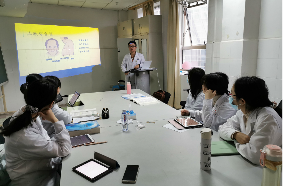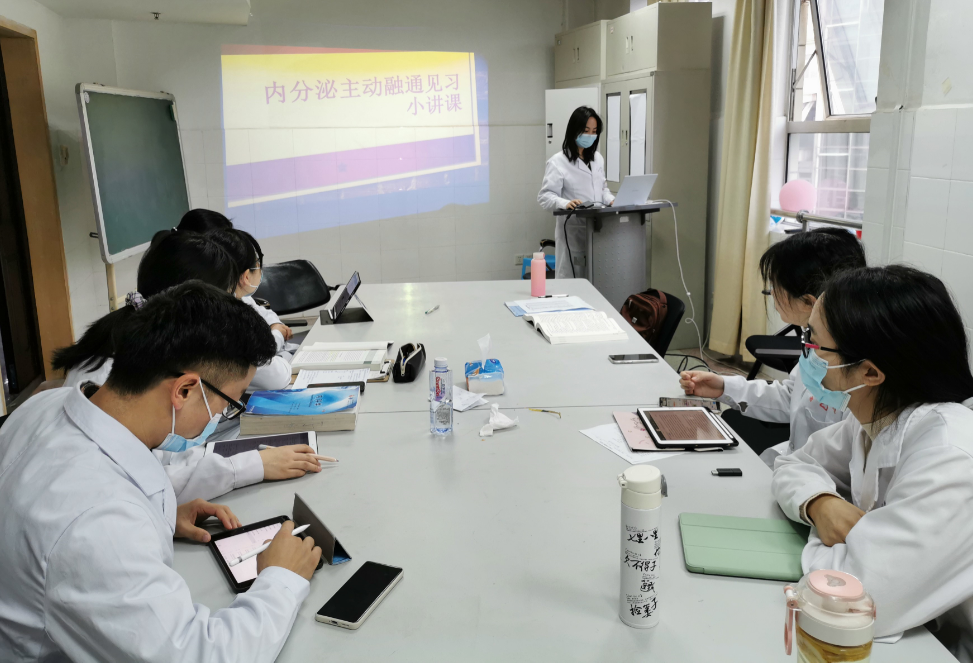 小讲课2人为一组,结合临床中所见习的病例自由选题,如“库欣综合征”、“低钾查因”、“多发性内分泌肿瘤综合征”等,依次查阅书籍、文献,做多媒体课件,上台讲课。大多数组别都能将主题内容发挥得淋漓尽致,从发病机制、病理生理、临床表现、诊断与鉴别、治疗、研究进展等各方面阐述得非常透彻。讲课的同学讲完后,其他人进行提问、讨论,老师再进行点评、补充。