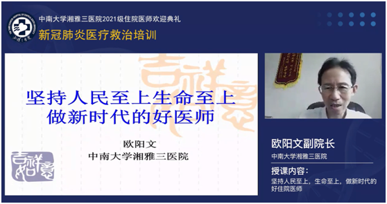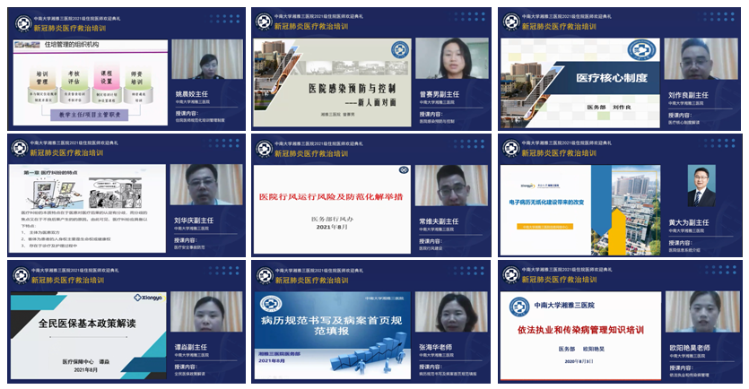 8月2日-6日,中南大学湘雅三医院顺利完成269名2021级住院医师新生迎新典礼暨新冠肺炎防控知识培训,其中专硕研究生134名,住院医师135名。根据新冠肺炎疫情防控最新要求,将线下集中面授模式转为网络线上教学模式,以湘雅精神和防控精神为核心、以防控知识传授为重点,确保非常时期“新鲜血液”入院疫情防控“不松懈”,培训“不断点”,质量“不降低”,上岗“不延期”。医院院长张国刚,党委委员、副院长朱晒红,毕业后医学教育办公室主任姚晨姣,研究生部副主任李夏雨出席迎新典礼开幕式。党委委员、副院长欧阳文及9位相关职能部门老师进行了远程授课。
