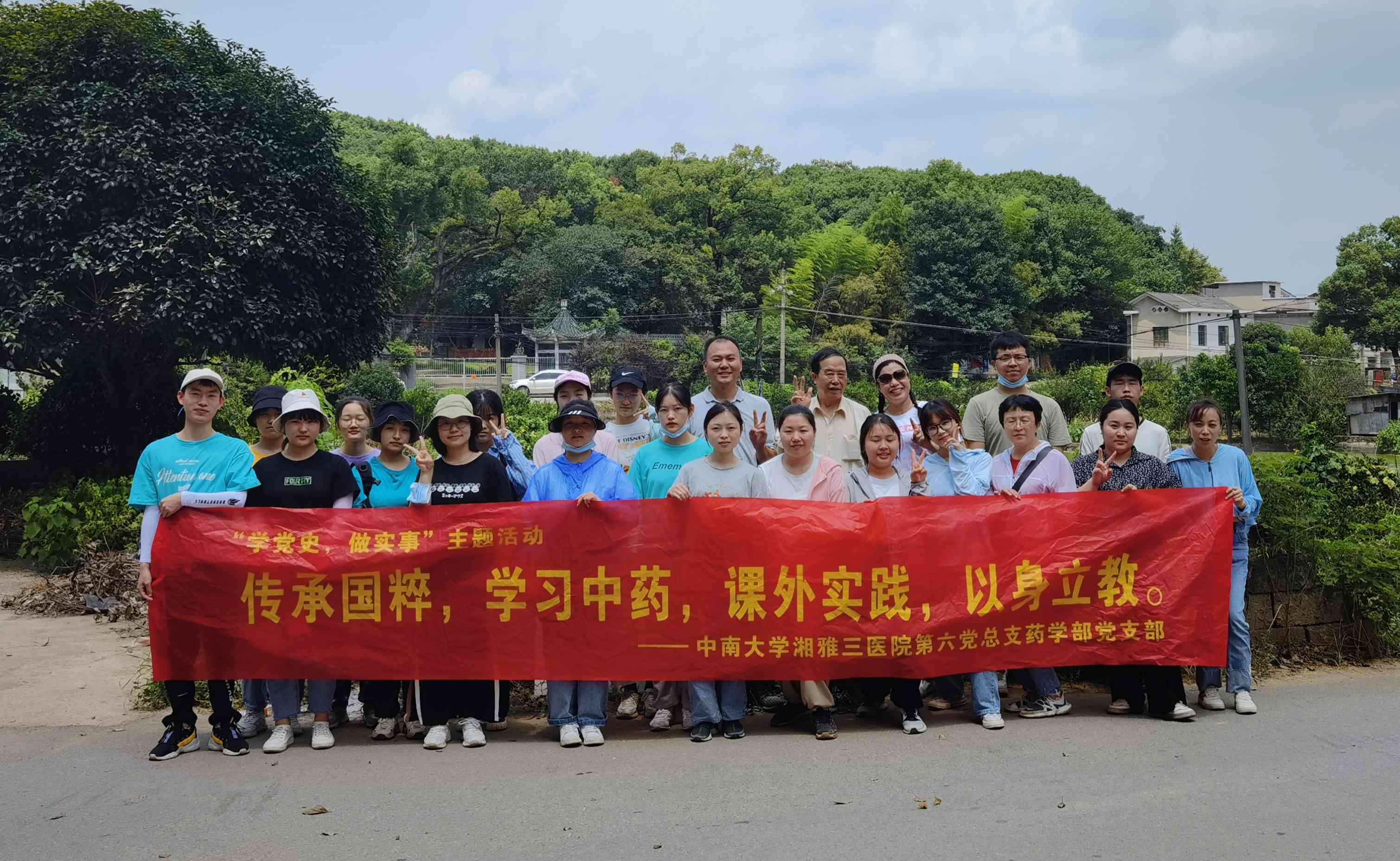 在建党一百周年之际,为弘扬我党“学党史、办实事”精神,中南大学湘雅三医院第六党总支药学部党支部于8月22日上午,组织实习生赴岳麓山开展“传承国粹,学习中药,课外实践,以身立教”为主题的采药识药活动。本次活动由药学部党支部策划,中药房朱胜平副主任药师、刘侨侨主管药师组织带队,并特邀湖南省中药资源普查专家指导委员会委员、医院退休中药专家李海军老师指导,带领7所高校多名实习生开展课外实践。