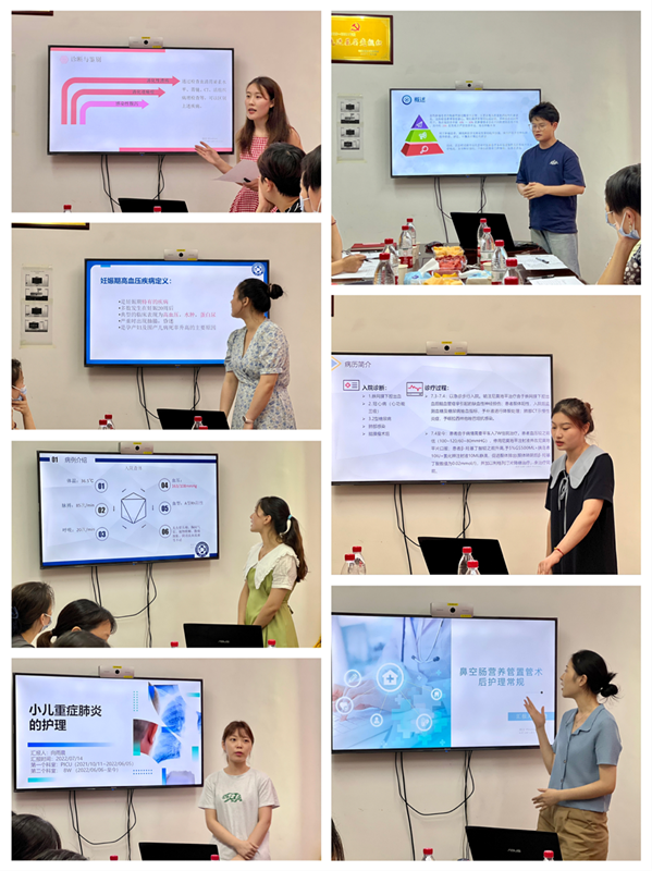 护理教研室副主任易琦峰对汇报会背景、考核流程及评分标准进行解读。七位规培护士以PPT的形式,就“胃泌素瘤小讲课”、“肿瘤患者的饮食营养需求与照顾”、“重度子痫前期护理查房”、“蛛网膜下腔出血的护理查房”、“鼻空肠营养管置管术后护理常规”、“小儿重症肺炎的护理”等专题进行汇报。苏红辉、王玲等护士长进行了专业点评,对同学们的专科知识和总结整合能力给予了高度的评价,学员们PPT制作精美,重点突出,讲课内容条理清晰,挥洒自如。既凸显了扎实的专科护理知识,又展现了对前沿热点的高度敏感。也对循证护理要求、规范化评估、报告语速、PPT制作细节等提出建议。