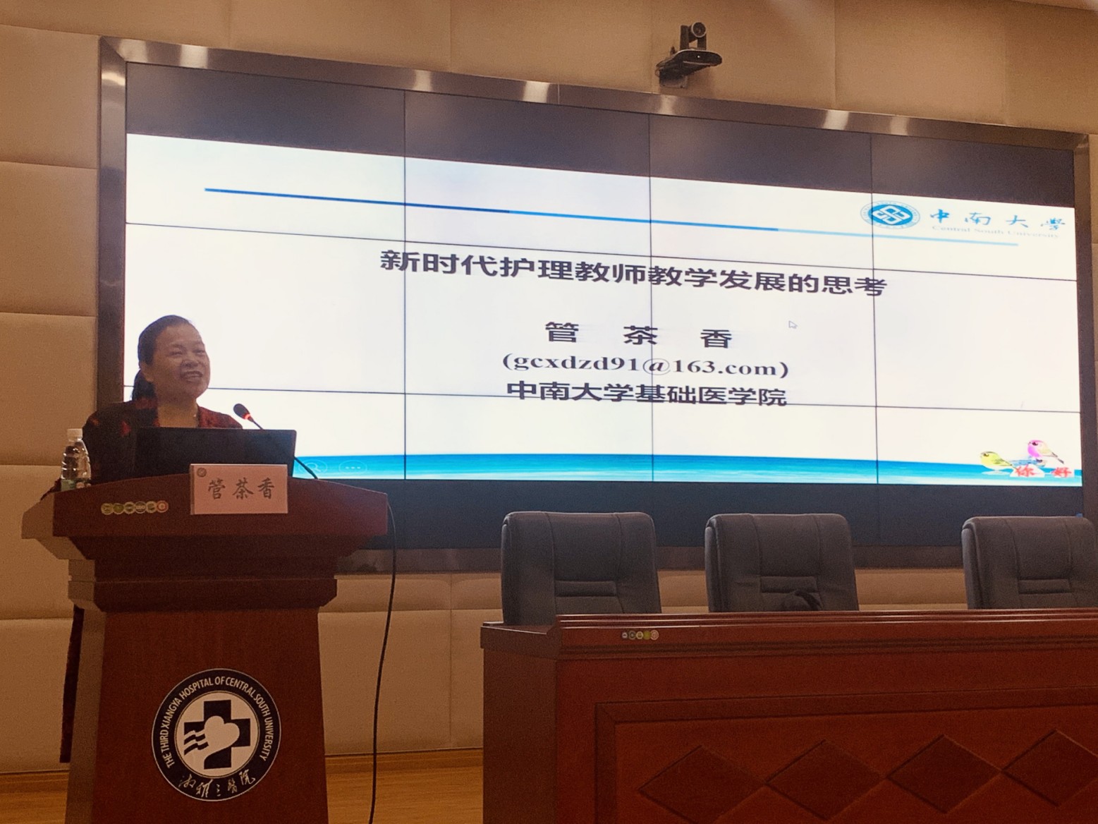 管茶香教授在轻松优美的“相逢是首歌”音乐声中,开启了风趣、机智、幽默的讲授。她指出,授课水平、课程建设、教材编写、教改项目、教学论文、教学成果是教师教学发展的6个显示度指标,她重点从教学设计、素材准备、授课技巧及教学方法运用等方面透彻分析了如何提高授课水平。她指出,好的课程应该让学生主动积极参与其中,在参与中体验学习的快乐;优秀的老师会认真去准备每一堂课,优质的教学可以让学生体验到课堂互动的有效性,从而激活学生的求知欲,开展真正意义上的学习。管院长的授课深入浅出、清晰流畅、精练朴实、生动形象、令人感觉耳目一新、豁然开朗,不仅像教学,更像是谈心,对于课堂教学有着示范的作用,让参与者对护理教学工作产生了共鸣与思考。