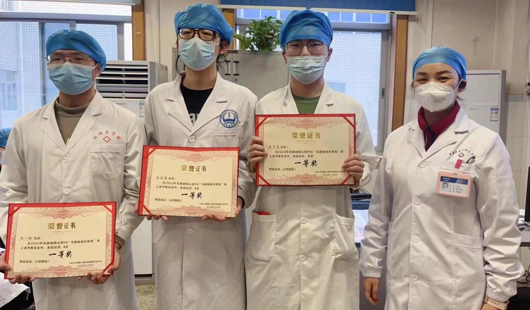 会上同学们分别展示了题为“粘多糖贮积症与耳鼻喉”“糖尿病耳病”“耳鼻喉结核病”“低维生素D与慢性鼻窦炎伴息肉激素抵抗”及“COVID-19的耳鼻喉表现”的读书报告。其中,刘一帆、李子豪、孙俊康同学凭借稳健的台风、精美的制作及充实的内容荣获一等奖。