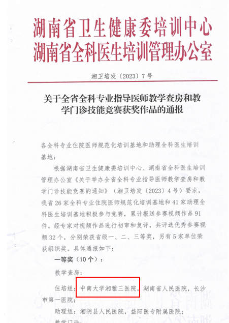 3月14日,由湖南省卫生健康委培训中心、湖南省全科医生培训管理办公室举办的全省全科专业指导医师查房和教学门诊技能竞赛中,中南大学湘雅三医院全科医学科“教学查房”参赛视频脱颖而出,以总分第一的成绩荣获湖南省全科专业教学查房一等奖,并被推荐参加下一轮全国全科教学技能竞赛。