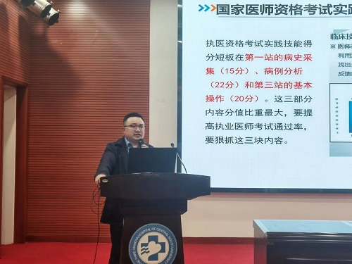 临床技能训练中心主任唐晓鸿对2022年医院考生参加国家医师资格考试实践技能考试情况作了详细分析,她指出不能忽视实践技能考试的任何一站点,同时需要对薄弱环节重点开展针对性培训;并进一步介绍了2023年医院国家医师资格考试实践技能培训安排,将统一调配全院各专业基地、教研室师资力量,对备考学员开展医师资格考试集中技能模拟培训和模拟练习。