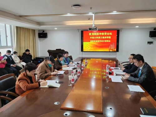 3月27日下午,新湘雅医学教育论坛暨课程思政教学设计答辩会在中南大学湘雅三医院科教楼八楼会议室召开。中南大学校级教学督导专家秦毅红、王晓春、杨新文,湘雅三医院教学督导专家刘浔阳,湘雅三医院副院长曹科出席会议,课程思政教学比赛课堂教学设计团队负责人及成员参加了此次答辩会,会议由医院教务部主任庄权主持。