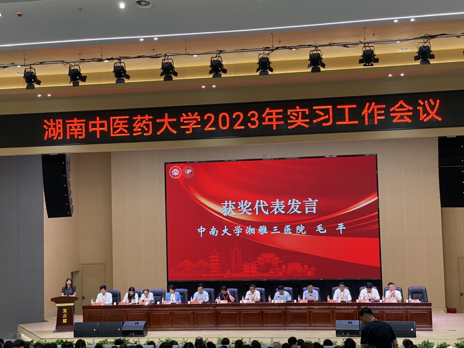 表彰会中,湘雅三医院护理学教研室被评为湖南中医药大学唯一一个优秀护理实习基地,苏红辉被评为实习管理工作先进个人,中医科李莎被评为优秀带教老师。随后,毛平代表优秀护理实习基地发言,她从“护理教学与师资管理、学生培训管理、科室教学管理”等三个方面介绍了医院临床护理实习管理经验,获得了全场的热烈掌声。