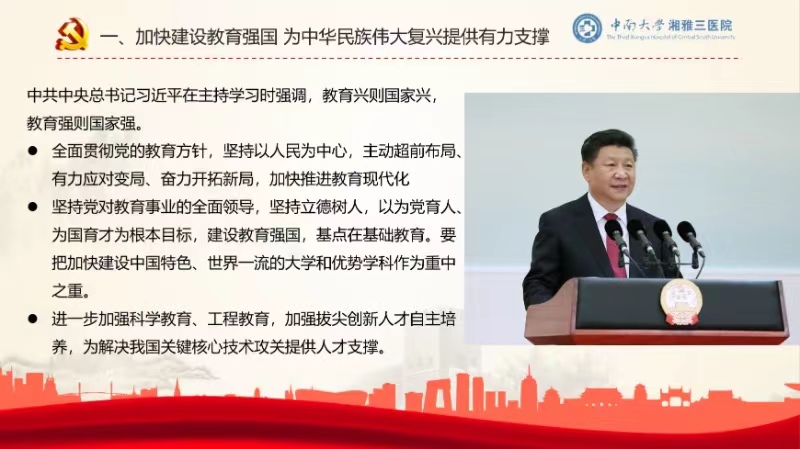 活动当天,同学们齐聚一堂,共同学习习近平总书记关于教育强国建设的重要讲话,并畅谈学习体会。同学们首先就“加快建设教育强国,为中华民族伟大复兴提供有力支撑”进行集体学习,会上抒发了自己的见解和体会。以崔志玥同学为代表的组内党员表示:“作为一名医学生,我深深感悟到进一步加强科学教育和工程教育的重要性。在医学领域,只有通过科学教育的提升,我们才能深入了解人体的奥秘,掌握前沿的医学技术,为患者提供更好的医疗服务。同时,在现代医学中,许多医疗设备和技术都需要依赖工程领域的创新和进步。作为医学生,我将积极参与科学教育和工程教育的学习,不断提升自己的知识水平和技能。”组长董洁琼补充道:“作为新时代的医学生,我也将努力培养自己的创新思维和实践能力,为解决我国关键核心技术攻关贡献自己的力量。相信通过共同的努力,我们能够为医学科技的发展做出更大的贡献,为人类的健康福祉谱写出更加美好的未来。”