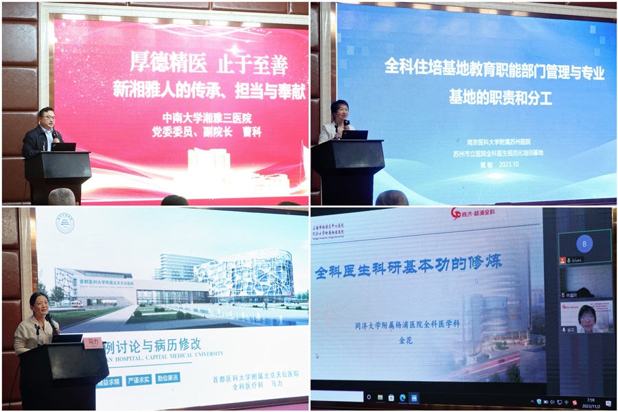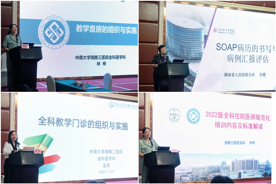 湘雅三医院毕业后医学教育办主任、全科专业基地主任姚晨姣对2023年版全科专业基地评估指标进行了全面、详细的解读,为各级住培基地的建设与发展树立了明确的目标与方向;此外,姚主任还做了“基于临床思维的体格检查带教”的专题讲座,为全科师资与住培学员的基本功训练提供了方法和规范。湘雅三医院全科医学科主任范自力用幽默风趣的方式,结合大量临床和教学实例,分享了“全科医学中的医患沟通与人文医学”的相关内容。湖南省人民医院全科医学科主任刘翠中就“全科住培专长化带教模式探索”进行论述,提出“全有所专”的创新模式有利于优化稳定全科医师队伍。湘雅医院全科医学科主任张卫茹就“全科临床诊疗思维的培养与实践”提出了对培育规范化培训全科专业住院医师的宝贵经验。中南大学湘雅二医院全科医学科主任罗荧荃及中南大学湘雅三医院老年医学科副主任肖广芬分别做了“如何进行教学反馈”和“如何设计和实施临床小讲课”为主题的精彩报告,开拓了临床带教的思路与方式,能更好地调动住培学员的主观能动性,提高教学效果和推进教学课程改进。湘雅三医院全科医学科项目主管林桦副主任医师对“2022版全科住院医师规范化培训内容及标准”进行了详细解读,进一步强调了分层递进式规范化培训的要求,明确了各轮转科室需掌握的理论与实践内容;林桦老师还开展了“全科教学查房的组织与实施”工作坊,采取讲授、观摩、讨论与点评相结合的形式,规范了教学查房的模式与流程,强调了课程设计与师生互动的重要性。湖南省人民医院全科医学科伍媛副主任医师及湘雅二医院雷思医师运用工作坊的模式分别就“SOAP病例规范的书写及点评”、“全科教学门诊的组织与实施”进行了讲解和演示,并引发学员积极参与和讨论,收到了良好的教学效果。