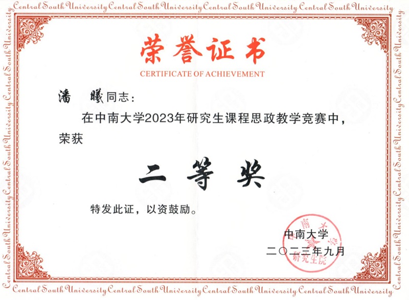 为提升中南大学教师课程思政课堂教学能力,全面推进课程思政建设,中南大学研究生院近期成功举办2023年研究生课程思政课堂教学竞赛,湘雅三医院肿瘤科潘曦荣获二等奖。
