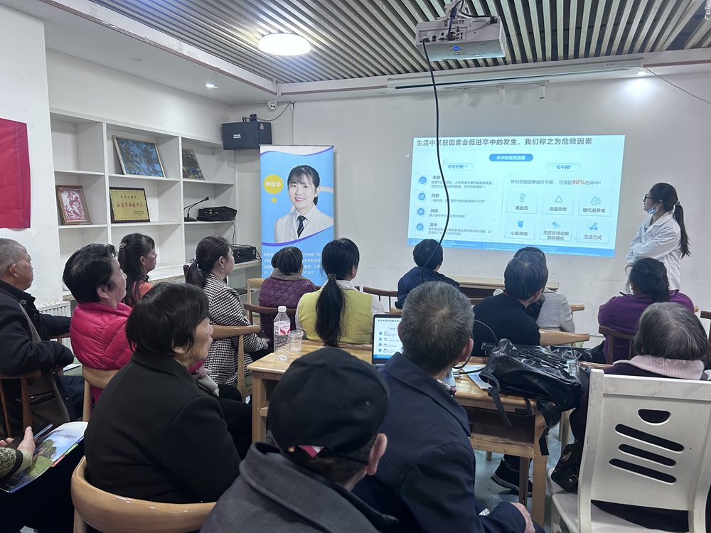 讲座现场,在韩老师的前期指导与现场把关下,2组同学化身“科普讲师”,围绕卒中的发病原因、早期识别技巧、紧急处理流程、日常预防措施等核心内容展开讲解。她用生动形象的语言拆解专业知识,详细演示“中风120”识别法,提醒居民关注肢体麻木、言语不清、视物模糊等危险信号,强调及时就医的重要性。同时,师生团队还针对居民提出的高血压、糖尿病等基础疾病与卒中的关联问题,进行耐心解答,提供个性化健康建议。