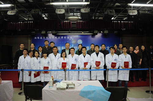 院长陈方平发表了讲话。他指出临床技能是专业学位研究生的基本技能之一,中南大学拥有全国高等医学院校大学生临床技能竞赛的特等奖二连冠,希望湘雅三医院的学子能再接再励,争取在今年的全国高校技能大赛中实现中南大学特等奖三连冠,再创辉煌!最后由出席嘉宾对获得一、二、三等奖的选手进行颁奖,并留影作纪念、鼓舞获奖选手以此为勉、再造佳绩。