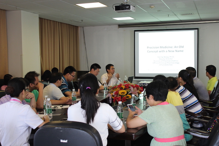8月24日上午10点,来自湘雅三医院和药学院的青年学者和研究生们来到我院外科楼十九楼移植科会议室,聆听由我院科研科和青科协主办、阳国平主任主持、来自美国FDA(Food and Drug Administration)药品审评中心定量药理室副主任王亚宁博士带来的 “Precision Medicine: An Old Concept with a New Name”学术报告。