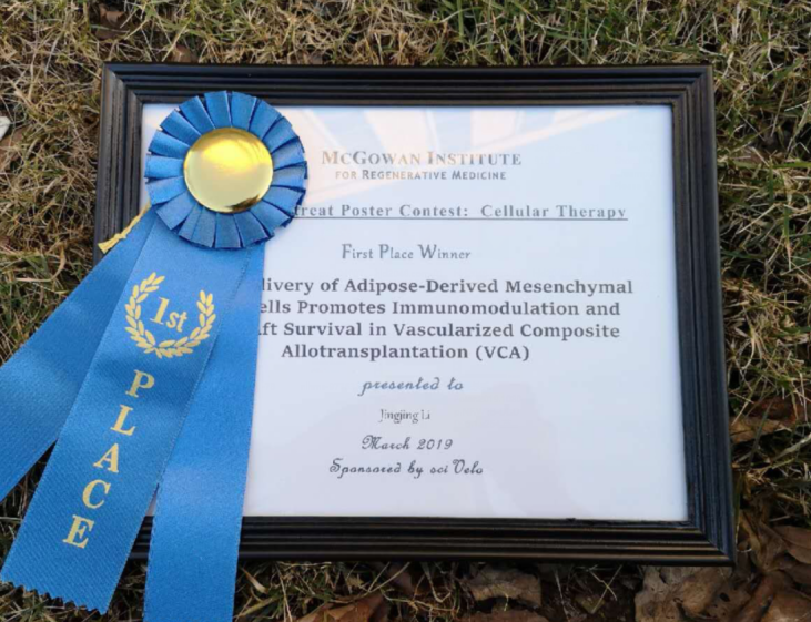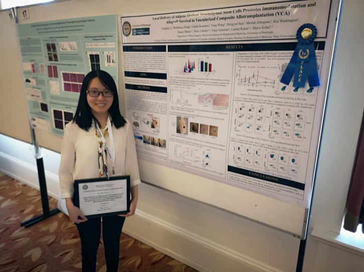 李晶晶在大会上介绍了脂肪干细胞促进复合组织瓣修复的研究成果。据悉,该专题共有三位发言人,其他两位分别是卡内基梅隆大学生物工程系Keith Cook教授、杜肯大学药学系Devika S. Manickam助理教授。随后,李晶晶还以壁报(Poster)形式介绍了脂肪干细胞的研究成果,该大会共有113件作品获得壁报展示资格,其中,李晶晶获得壁报展示第一名。