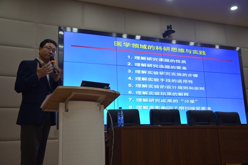 随后,海外导师作了“医学领域的科研思维与实践” 为题的专题学术报告。报告从临床病例的研究科学问题出发,对研究课题性质、研究选题的要素、实验研究的实施步骤、实验手段的适用性等8个方面进行了深入浅出的详细讲解,提出科研选题的基本要素就在于选题的意义、新颖性和深度,并以脓毒症治疗中所面临的挑战为例,详细讲解了实验研究中所需要注意的各种细节和因素。整个报告的内容”干货“满满,回答了在科学实验研究当中可能会遇到的各种具体问题及其解决方法和思路。相关内容既引用了科学研究中的经典案例,同时还代表了当前科研领域的最新进展。讲座内容生动详实,引起了大家的浓厚兴趣,整个报告会现场气氛活跃,参会老师和同学均表示此次报告会内容详实,收获颇丰,会后还有不少参会的年轻医师及研究生同学也围绕在海外导师面前积极提问。