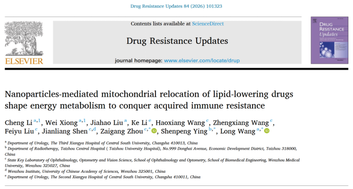 近日,国际顶级期刊《耐药性更新(Drug Resistance Updates,IF:21.7;中国科学院一区Top期刊)》在线发布了中南大学湘雅三医院泌尿外科王龙/熊伟团队题为“纳米颗粒介导的降脂药物线粒体重定位重塑能量代谢以克服获得性免疫耐药性(Nanoparticles-mediated Mitochondrial Relocation of Lipid-lowering Drugs Shape Energy Metabolism to Conquer Acquired Immune Resistance)”的原创性研究成果。湘雅三医院王龙教授为论文共同通讯作者,湘雅三医院熊伟医师、2022级博士研究生李铖为论文共同第一作者,湘雅三医院为论文第一署名单位兼通讯作者单位。
