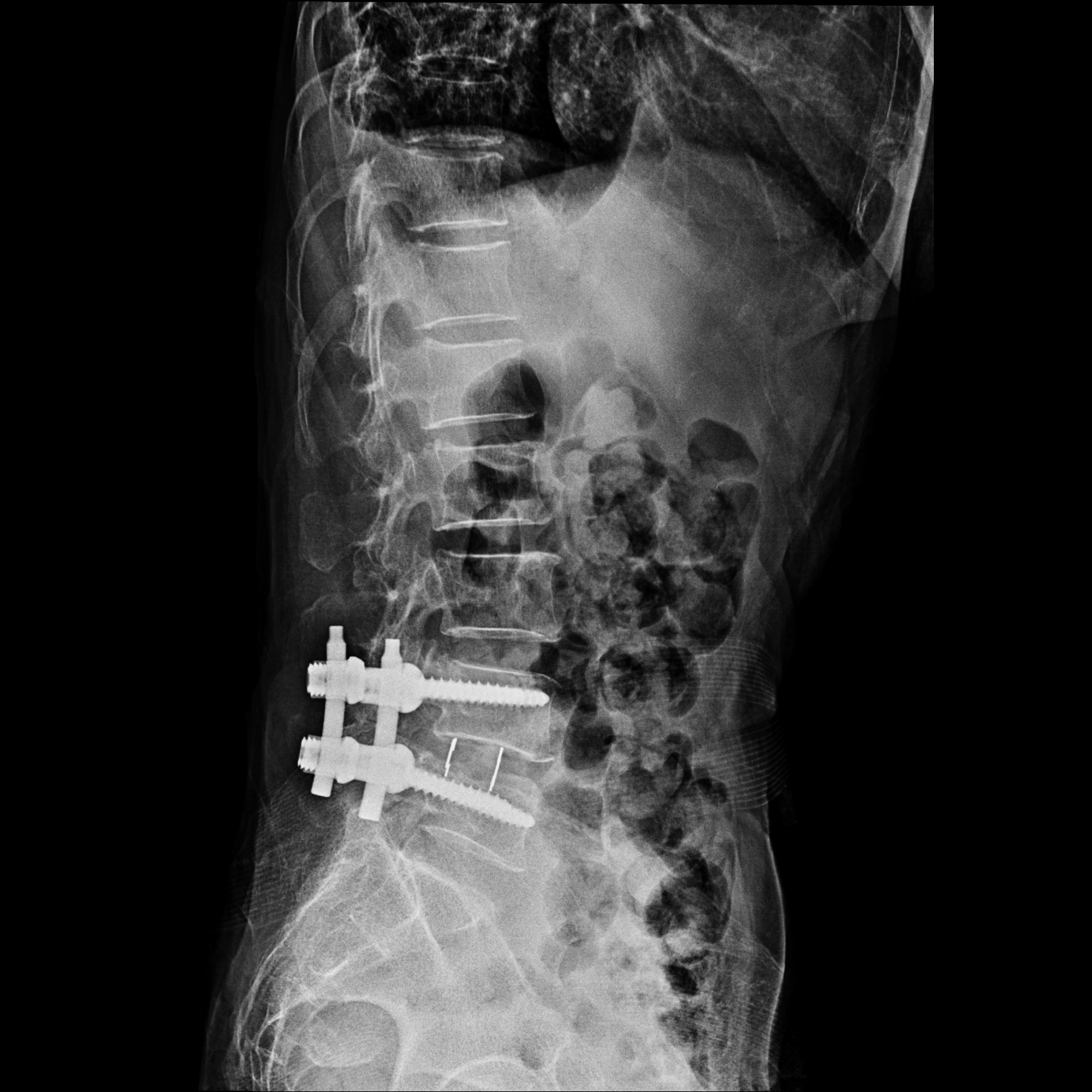 我院脊柱外科团队经过科室会诊讨论后,决定采用微创腰椎斜外侧入路椎间融合术。以王剑龙主任、苗惊雷副主任医师、陈世杰主治医师及李劲松博士后组成的治疗团队在张朝跃教授、詹瑞森教授的指导下仔细分析病人的临床资料与影像学特点,进行了精心地术前准备,于12月4日上午9点开始手术。术中仅在患者左侧腹部椎体前缘2横指处做了一个约4cm的纵切口即可抵达手术部位,按照肌纤维方向钝性分离腹壁肌肉后到达腰椎侧前方,在主动脉与腰大肌间隙之间放置扩张通道,处理椎间隙并恢复间隙高度,使滑脱复位,放置合适大小的融合器。后路同样应用微创方法植入椎弓根螺钉固定。患者术后6天下床,腰痛及双下肢麻木症状完全消失。