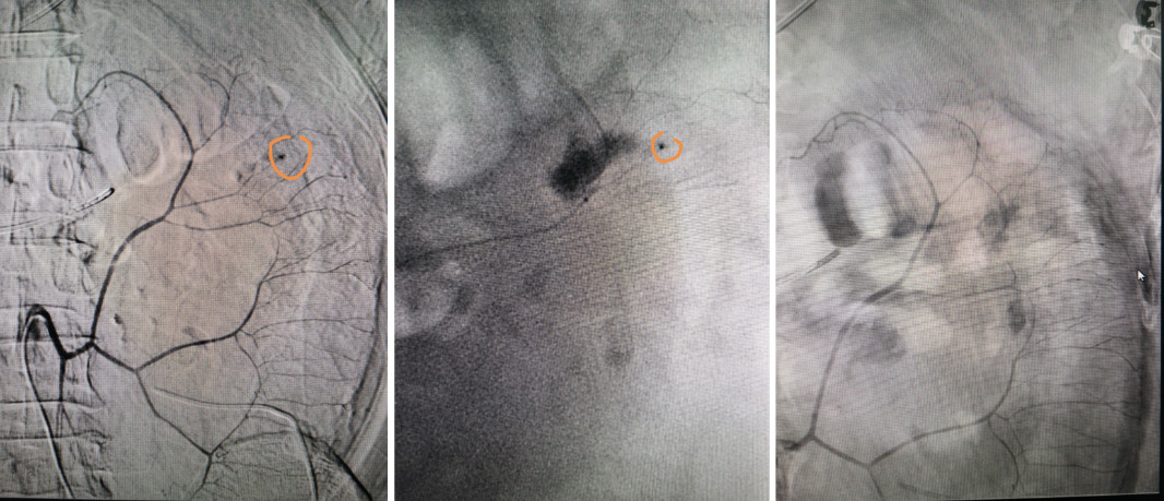3月11日20:00左右,在告知患者家属病情及行急诊介入手术止血的必要性后,家属表示同意并签署手术同意书,随即患者被推入DSA手术室。放射介入团队张声旺、骆雷、郭睿、李心园迅速行经导管腹腔干动脉、肠系膜上动脉、肠系膜下动脉造影,术中造影发现结肠脾曲区域肠系膜下动脉三级小分支的末梢出血。明确出血责任血管后,考虑到结肠脾曲侧支循环相对较少,如果介入栓塞系膜动脉范围稍大就会造成肠缺血坏死、栓塞范围稍小就不能有效止血,栓塞靶血管必须非常精准才有可能有效止血并避免肠缺血坏死。放射介入团队在仔细、冷静分析患者血管具体情况后,通过微导管超选择插管并注入栓塞剂,栓塞后造影显示完全止血后患者返回EICU。介入术后患者一般情况明显好转,血红蛋白逐渐升高,3月16日患者复查腹部CT报告结肠脾曲系膜区域未见活动性出血,且结肠脾曲未见缺血征象。