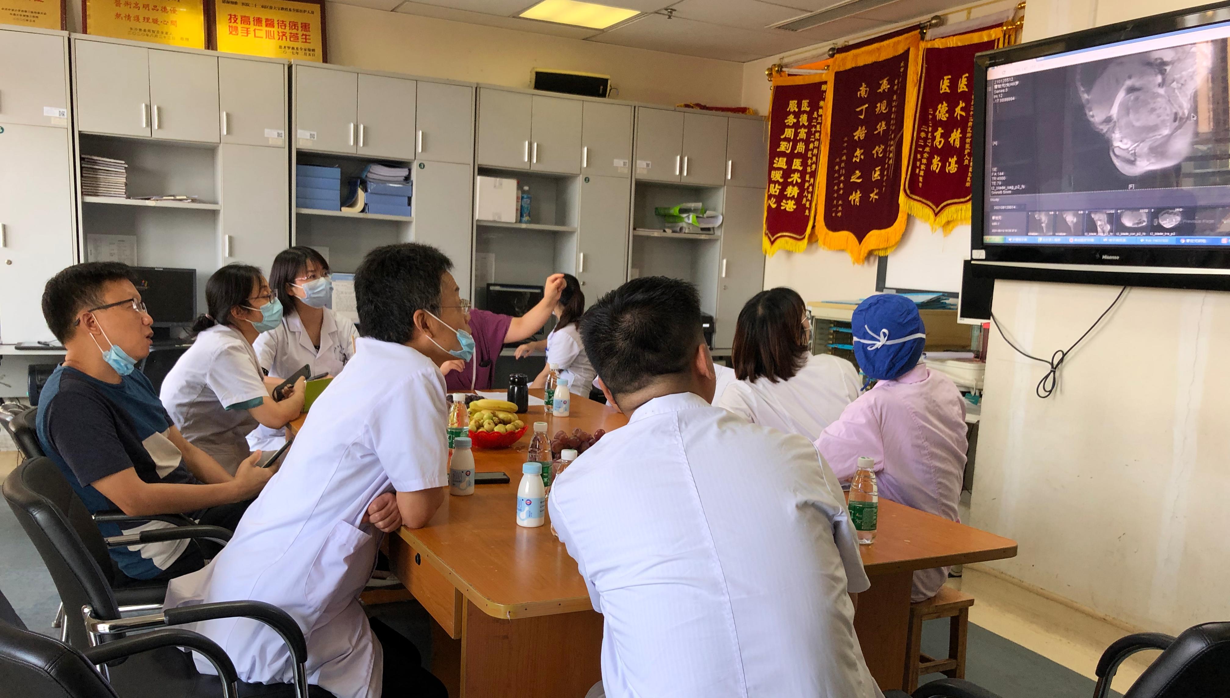 患者曹女士,48岁,因“腹痛4年,加重1年”入院。诊断为子宫腺肌症并腺肌瘤,子宫增大如孕3+月大小,需行全子宫切除术,但患者仅有4岁小儿的身高体重(身高115cm,体重23kg),且合并先天性罕见严重脊柱畸形——胸腰椎融合、胸廓发育不良、脊柱后凸导致盆腔狭窄、剑突至耻骨联合距离仅4cm,手术难度极大,手术风险极高,多家医院婉拒为其实施手术。患者近1年来腹痛症状进行性加重,服用止痛药后仍无法缓解,严重影响正常生活。2021年8月,患者慕名前来中南大学湘雅三医院就诊,入住妇科22病区。患者满面愁容,忧心忡忡,医护人员对其多次予以宽慰和疏导。在科主任徐大宝教授的指导下,病区负责人杨益民副教授组织骨科、麻醉科、放射科、呼吸内科、泌尿外科、疼痛科、ICU、医务科、手术室护理中心多学科联合诊疗,充分评估手术风险、完善术前准备,并于科内讨论制定完备的手术方案。