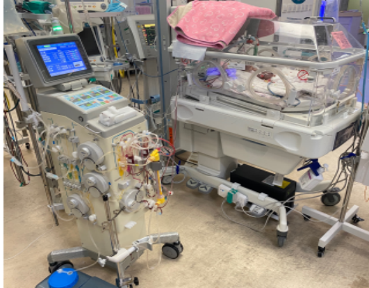 患儿系28+6周早产儿,出生体重仅450g,生后10天因急性肾功能衰竭、无尿由外院急诊转运入住湘雅三医院NICU。入科时,患儿因极度水肿,体重已增加近一倍,且患儿除肾功能衰竭外,同时存在包括心、肺等多器官功能衰竭,内环境严重紊乱,随时有生命危险。NICU团队在入院后立即紧急给与患儿腹膜透析治疗,第二天患儿水肿就较前明显消退,生命体征趋于稳定。经过10天的腹膜透析,患儿的电解质紊乱也得到纠正,但患儿的肾功能始终恢复不理想,仅曾短期排少量尿后持续无尿,且水肿也开始有再次加重的趋势,说明此时腹膜透析已近极限。面对家长的殷切期盼,NICU团队经过综合分析,与家长充分沟通后,决定为该患儿实施连续肾替代治疗(CRRT)治疗。