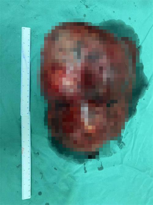 1月14日下午,外科楼6楼的等候区,刘某的儿子在手术室外面忐忑不安地来回踱步。手术室里面,罗宏武教授和张玉平副教授带领的手术团队却在有条不紊地探“腹”取“瘤”,术中探查瘤体包膜完整,成膨胀性生长。由于瘤体长时间地挤压,肝动脉、门静脉及胆管完全失去了正常的解剖结构,且巨大的瘤体严重限制术者的视野和操作空间,但团队凭借精湛的手术技能和丰富的手术经验,经过5个钟头的鏖战,沿着中肝静脉、下腔静脉和瘤体边缘仅5mm的缝隙最终成功地将瘤体侵犯的右半肝及尾状叶完整切除,最大程度地保留了残肝功能和肝中静脉完整,取出的标本体积为:24x18x16cm,重量为2.35kg,为两个巨大瘤体的融合灶。术后,在肝胆胰外科Ⅰ科护理团队的悉心护理下,患者身体状况恢复良好,各项检验指标正常,目前已能下床活动,而刘某儿子的脸上也绽放出了久违的笑容。