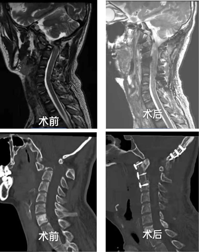 患者高某,23 岁,本是一位帅气小伙,一年前因骨结核造成多处骨质破坏,辗转省内多家三甲医院就诊,疗效不佳且病情逐渐加重。来院就诊时严重消瘦,不能行走,已出现心率快,呼吸急促,四肢不全瘫痪,大、小便困难症状。患者颈部呈右偏屈曲强迫体位,头部被动活动受限,左侧上肢肌力1级,右侧上肢肌力3级,双下肢肌力3级,病理征阳性。影像学显示脊柱、胸骨、肋骨多处病损,尤其是颈2椎体的90%破坏,寰枢关节脱位,导致严重的脊髓受压。