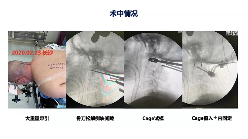 脊柱外科遂组织全科专家进行病例讨论,制定了详尽的手术方案:通过寰枢椎侧块间隙松解,植入人工peek材质Cage(融合器),恢复颅颈交界区正常序列,从而解除齿状突对延髓的压迫。寰枢椎侧块间隙松解技术风险极高:手术操作区内侧为高位颈脊髓,外侧为椎动脉,安全区域不足1公分,同时表面覆盖着丰富的静脉丛,易引起难以控制的大出血。脊柱外科颅椎组此前积累了大量的手术经验,寰枢椎侧块间隙松解技术已经熟练掌握。本例特别之处在于,松解手术完成后,在寰枢椎侧块间隙植入高度8mm的融合器,借此将齿状突从颅内“拔出”,达到寰枢椎复位减压的目的。