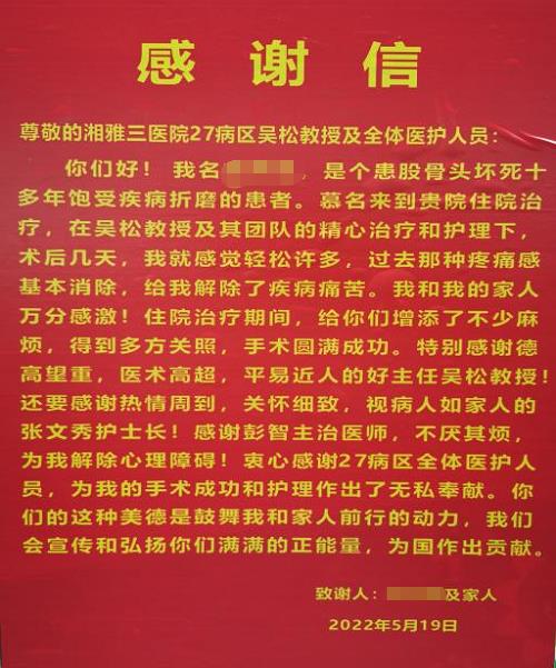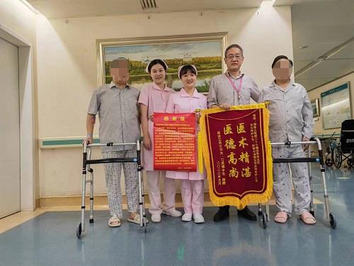 每次查房叔侄二人都特别激动,感谢吴教授团队为其解除了疾病痛苦。出院时,给科室送来锦旗及感谢信,对湘雅三医院关节外科医护团队精湛的技术给予了高度肯定。
