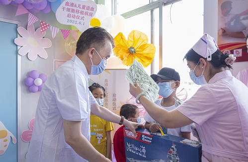 血液内科、儿科医护团队以及移植后康复的小朋友、即将入住新病房的小朋友共同参加了仪式。何庆南、陈方平教授代表医院为小朋友们赠送了节日礼物。