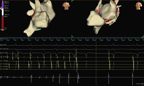 此次手术采用雅培Ensite三维标测系统和国际上最新的LiveView标测技术,使用HD-GRID高密度标测导管进行心腔内基质标测,在湘雅三医院独创术式HOT-AF指导下进行高功率消融(50W/43℃)。双侧肺静脉电隔离成功后,行心房顶部及冠状窦内膜面、二尖瓣峡部线性消融,紧接着采用LiveView技术找到了左心耳和右心耳等多个驱动灶并对其进行消融,患者最终恢复窦律。再次行电生理检查和LiveView实时动态标测,证实消融线双向阻滞,手术成功。据悉,本例是湖南省首台采用Ensite LiveView标测技术的持续性房颤射频消融术,这也开创了湖南省新型动态标测系统的新纪元,进一步提高了复杂的持续性房颤手术成功率。