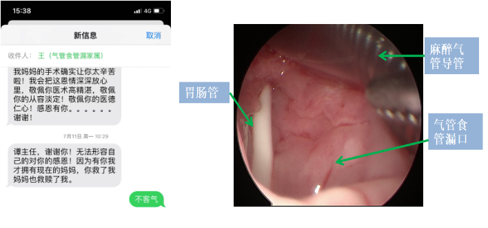 本例患者属于巨大的气管食管瘘,波及了颈段和胸段气管和食管,病情重,营养差,手术难度大。湘雅三医院耳鼻喉头颈外科团队采用了个性化麻醉技术,内镜微创技术,皮瓣技术,喉气管旷置策略,避免了开胸,成功将她从濒临死亡的线上救回,体现了耳鼻咽喉头颈外科高超的医疗技术能力和精准的护理能力。