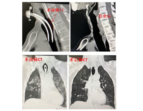 6月6日,患者家属得知湘雅三医院耳鼻咽喉科综合实力强,抱着最后一线希望,带着所有资料找到了谭国林教授会诊,谭教授仔细阅评所有医疗资料后,给出了意见:(1)气管食管瘘导致的吸入性肺炎非常严重,整个肺部几乎是“白肺”,这是致命的;(2)气管食管瘘巨大,涉及到了颈、胸两个解剖区域,治疗难度大,气管支架或者食管支架不可能解决问题,但认为患者还是有希望通过手术治愈的。家属遂将患者从外院ICU通过120直接转入了头颈外科病房,先进行了精准的气道管理和专业的营养治疗,并实施了多次全科疑难病例讨论及多学科会诊。病情稍有好转后,在麻醉科实施个性化麻醉下,采用颈部切口,达到气管食管瘘上方,内镜检查发现漏口有6.5厘米长,下方接近气管隆突,上方接近环状软骨,手术操作难度大,需要麻醉科反复拔除麻醉气管导管才能操作,在内镜下精准切除气管食管瘘的漏口边缘,将气管与食管完全分离,然后分层缝合食管,制作10厘米长的颈部带血管蒂皮瓣修复整个气管后壁及侧壁;并将喉临时旷置,气管外提,以阻止经喉部的误吸。术后经过抗感染,鼻饲胃肠营养、肠外营养治疗及支气管灌洗等治疗,患者的感染指标逐渐好转,咳嗽咳痰越来越少,术后20天的影像资料显示气管食管瘘消失,肺部感染明显好转,遂转到康复医院继续进行吞咽康复训练。术后50天,患者返回科室再次手术,将旷置的喉和外提的气管接回原来的解剖部位,回家继续进行吞咽训练,并指导其发音训练,术后3个月再次来医院拔除了气管导管,封闭了颈部的气管切开造口。此次例行的复查结果显示,患者的吞咽、呼吸、发音功能基本恢复正常,肺部遗留一些纤维化外,肺部感染完全消退。
