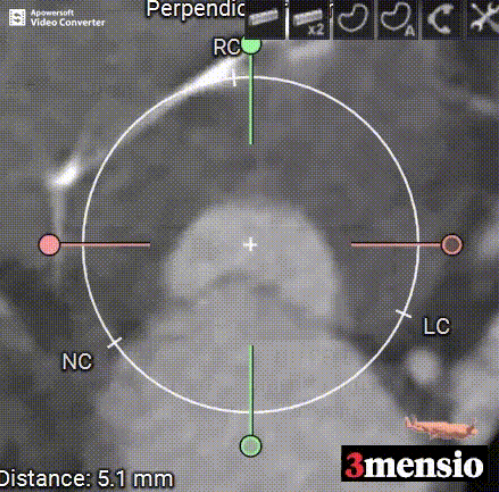 术前经过充分的CT评估,患者属于Type1型二叶式主动脉瓣,瓣叶增厚伴中重度钙化,左冠瓣叶钙化明显,R-N间可见钙化融合嵴,左室流出道呈稍敞口型。左右冠开口高度尚可,左右冠切线位瓣叶长度<冠脉开口到瓣叶附着缘距离。手术采用采用全麻+TTE的手术方式,以右侧股动脉为主入路,左侧股动脉为辅助入路。使用18mm球囊充分预扩,预装AV23瓣膜,瓣环上0-2mm定位释放,释放后多角度观察瓣膜释放形态及植入深度后,位置良好,冠脉血流灌注正常,微少量瓣周漏,跨瓣压差由术前的54mmHg降至术后的3mmHg。