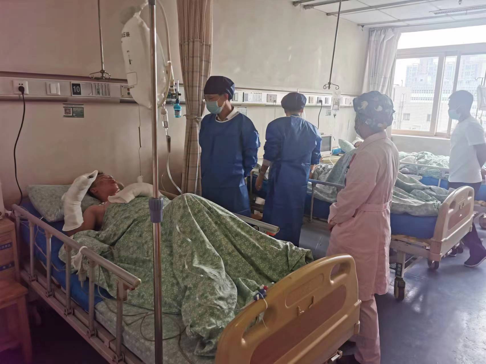 专家们床旁查看烧伤患者,由专科护士李曦、胡蛟、李佳、王川、欧阳玲姣等人汇报病例,护理组长严谨、钟竹青、余晓、阳萍对烧伤患者综合护理进行要点补充,并就目前危重烧伤患者VTE预防、疼痛、瘢痕功能康复、创伤后的心理问题征求专家意见。医疗专家针对血栓预防、药物的规范化使用、以及系统的康复功能训练给予一一指导。