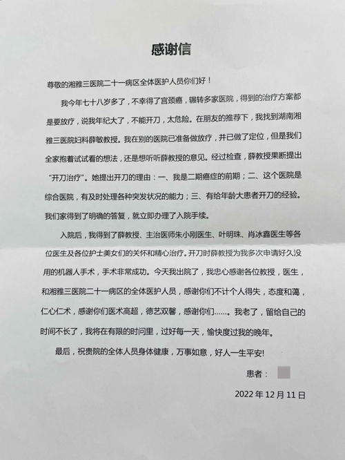 近日,中南大学湘雅三医院妇科收治了一名78岁高龄的宫颈癌患者,来自长沙本地的孔娭毑因“绝经后阴道流血”于某三甲医院就诊并诊断为宫颈癌IIA1期,外院考虑患者年龄大合并糖尿病等多种合并症,手术风险极大,不建议手术,但患者及其家属均想手术治疗,慕名找到薛敏教授,在医患双方的互信互助下,薛敏教授团队成功为患者实施达芬奇机器人辅助腹腔镜广泛子宫切除+双附件切除+盆腔淋巴结清扫术。术后患者出现发热、并发感染,在医患共同配合、积极治疗下,现孔娭毑恢复良好,已顺利康复出院。