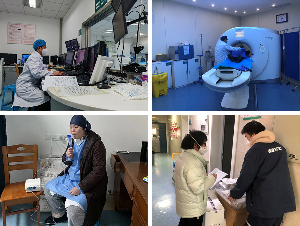 疫情爆发期间,放射科的医师、技师、护士、登记员成了最辛苦的群体,尤其是一线的“小阳人”们都坚持带病上岗。大家中午连班、晚上加班、周末无休,没时间吃饭,没时间喝水,没时间上卫生间,CT机器都累坏了两台。CT组彭松坚持带病上班,作为组长还要解决在人手严重不足的情况下,保证CT检查的有序进行。张雄健经常嘶哑着喉咙在检查室门口呼喊着患者的名字,又耐心的教病人摆好体位。诊断组李臻在高烧39.5℃,身体极度不适的情况下,仍坚持站好最后一班岗,审核完最后一个报告。白血病合并新冠感染的患者在做完CT检查后突发癫痫,总住院陈程迅速到岗处理,患者得到有效处理。登记室陈维即使身体不适,需要吸氧才得以缓解,仍坚守着登记室这一窗口阵地。杨策军在咳嗽、眩晕的双重体验下,仍坚持着防控物资的管理、登记、发放工作,杜绝浪费。“孕妈妈”张娟在36周孕龄并且仍然“阳”着时仍坚持肿瘤病人的细胞培养。在这场疫情防控阻击战中,每个人都成为了“逆行者”“守护者”,都在尽自己的最大能力守护这万家灯火。他们用信念、责任、坚守、担当,书写着一段段动人的故事,一个个感人的温馨瞬间。
