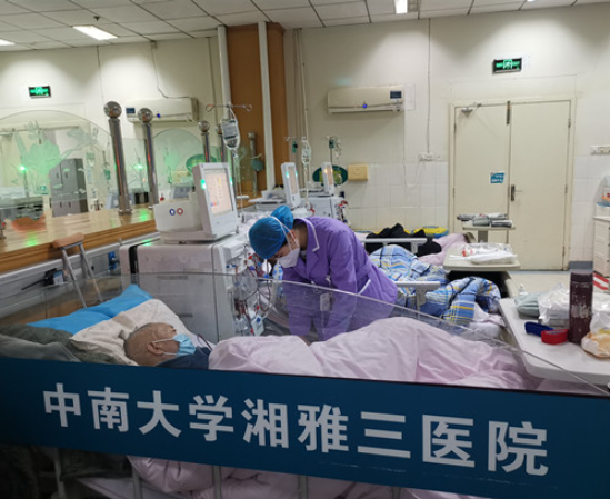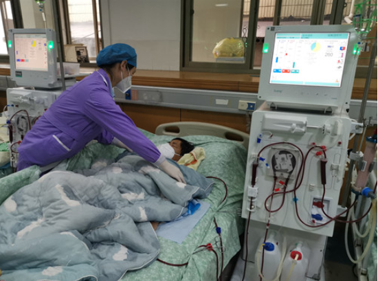 血液透析患者是一个特殊群体,他们的生命依靠规律的透析治疗维持,每周必须雷打不动地做2-3次血液透析治疗,这对于他们来说就像吃饭、睡觉一样重要。如果透析不规律就会导致患者发生心衰、高钾等并发症,随时都会危及生命。三年以来的抗疫,血液净化中心在王建文主任的带领下一直坚守在最前线,随着疫情防控的主战场由防控感染转为医疗救治,血透阳性患者的增多,重症患者也随之增加,需要行床旁血滤的患者直线增加。肾脏风湿免疫科张浩主任立即对疫情形式进行研判,在现有人力资源紧张的情况下,坚持人民至上、生命至上,把保护人民生命安全摆在首位。肾内血透室一盘棋运转,病房护士辅助床旁CRRT治疗,血透室尽全力开通阳性病人透析生命通道,降低重症病人数量以及并发症发生几率,全力保护这些不得不逆行的血透病人。