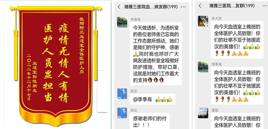 医护人员的辛苦付出,透析病人有目共睹。他们发自内心的感动,送来感谢信与锦旗感谢。他们自觉维护血透室秩序、自觉全程透析戴好口罩配合医护人员,阳性病人自觉遵守科室各项院感制度,相互监督、相互帮忙与鼓励,他们与疫情、病魔百折不饶的透析精神感动了所有医护人员。