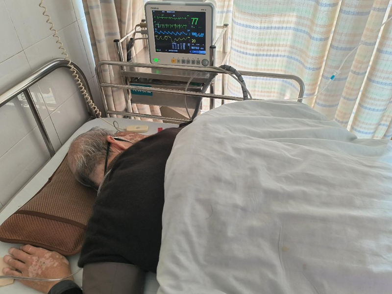 今年66岁的徐嗲嗲是长沙本地人,于1月13日顺利痊愈出院。而14天前的他,还是一例“白肺”新冠重型患者,同时伴有冠心病、糖尿病及高血压等基础病。2022年12月17日,徐嗲嗲不幸感染上新冠,在家休息了4天后,感觉明显好转的他在外面溜达了一整天,未曾想回到家后突然发烧,呼吸困难。吃了两次布洛芬又坚持了两三天的徐嗲嗲,终于在第9天发现到自己走不动路了。徐嗲嗲的儿子也意识到父亲的情况不容乐观,立马购置了制氧机和指脉氧,一测血氧就吓一跳,徐嗲嗲的血氧饱和度竟然跌到了50%多。2022年12月29日,由于呼吸困难,家属用轮椅推着徐嗲嗲来到湘雅三医院呼吸与危重症医学科门诊就诊,医生当即将他收治入院。