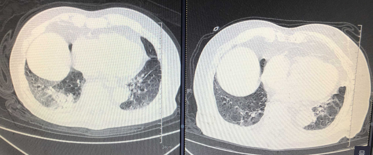 入院后,医生马上为徐嗲嗲完善各项检查,肺部CT显示他有60%-70%“白肺”,肺部病变严重,血氧饱和度也仅有71.2%。针对徐嗲嗲严重缺氧的情况,医生指导他进行俯卧位通气并给予心脏药物治疗,帮助他提升血氧饱和度。由于肺部大部分面积变白,徐嗲嗲还是面临着是否要转入ICU插管的抉择。