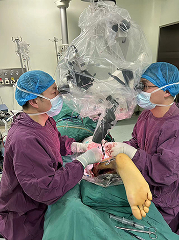 老何下肢的主要动静脉都已被锐利的骨折“拦腰”截断,因为损伤重,时间长,还有数厘米血管挫伤、栓塞,动脉的修复手术必须在一个止血带时间内完成,才能恢复下肢供血。此时已近凌晨,保肢团队成员分为两组,一组在高倍显微镜下解剖受损血管,另一组在切取移植静脉,没有丝毫倦怠,不敢半点懈怠,手术室静谧得只有监护仪发出的规律的“嘀嗒”声,手术进行得有条不紊,两组成员就像一个优秀医生的左右手,配合默契,心往一处想——保肢,力往一处使——接通肢体生命的安全线-血管。“4.29”救治以来,创伤骨科保肢团队每周四组织显微技术训练,从无间断,该训练得到了医院临床技能训练中心主任唐晓鸿等老师的大力支持。练兵千日,用兵一时,看到他们在罗令的带领下展示娴熟的技术,很难想象他们中的大多数在半年前还是个门外汉,半年来,创伤骨科年轻医生还成功完成断指再植近10例。时针指向凌晨3点,受损的血管被完全修复,苍白的肢体重获红润,宛如久旱遇甘霖,足背动脉的跳动欢快有力且富节奏,像极美妙的交响乐。