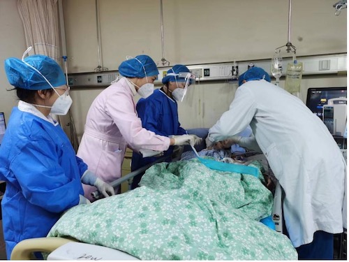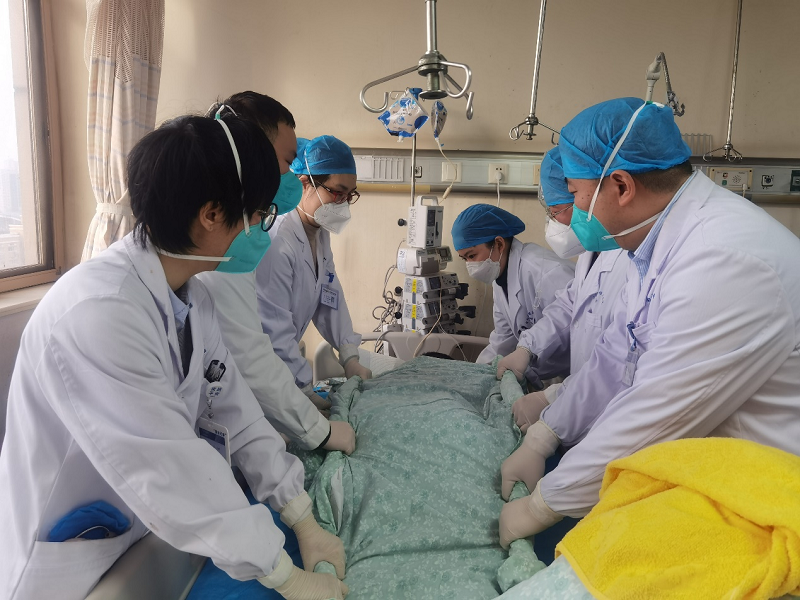 2022年12月31日,在院领导以及医务部、护理部、医学装备部等行政后勤职能部门的大力支持下,短时间内将20病区心胸外科整体改建为有24个床位的新冠重症监护室,全部配备监护仪、呼吸机,能常规进行血液净化、重症超声、气管纤支镜及胃镜治疗,是全院最大的ICU。团队组建来自多学科,包括中心ICU、胸外科、麻醉科、手术室、心内科、神内ICU、血管外科、口腔科、皮肤科、血液科、移植ICU及消化内科。新的重症病房的组建并非一蹴而就,从医护人员的选派到仪器设备的到位,从学习有创测压监测到从容应对血液净化管理,从内心惶恐的重症新手到淡定自如的老手,离不开每一位成员的艰辛付出,团队完成了一次完美蜕变。