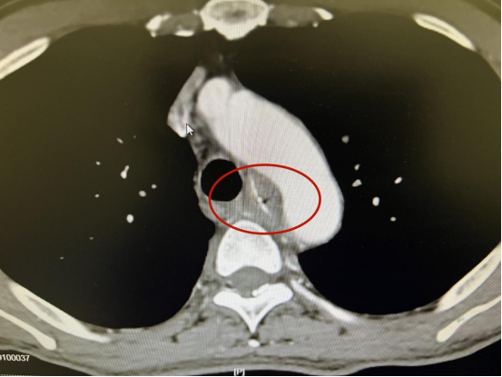 据介绍,患者于3月13日在北京某医院检查出鱼刺卡喉后未予治疗,于14日慕名来到中南大学湘雅三医院耳鼻咽喉头颈外科门诊。当时,患者自诉7天前进食晚餐时误吞鱼刺一根,当即胸骨上窝出现持续性刺痛,自行采用“喝醋疗法”后疼痛症状未见明显改善且随之出现吞咽困难症状。经门诊胸主动脉CTA示:患者主动脉弓轻度粥样硬化,T4-6椎体水平有异物穿透食管壁,离主动脉弓仅2mm,情况十分危机。