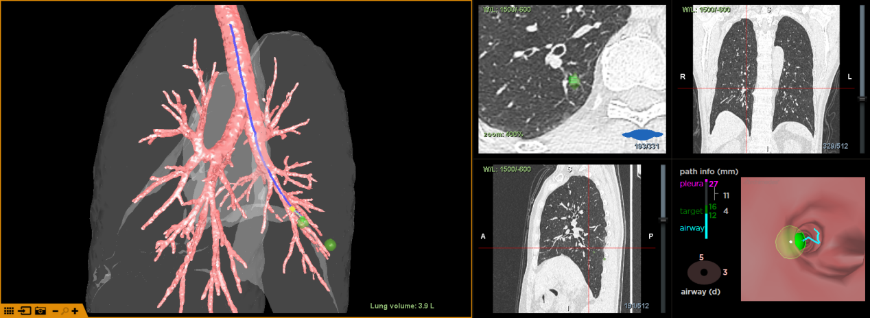 术前,通过导航系统对患者进行CT三维重建规划,评估分析,患者病灶位于右肺下叶后基底段,大小约10mm*9mm,距离胸膜有一定距离。为精准定位肺结节,明确切除范围,同时尽可能保留正常肺组织,金龙玉教授团队决定应用增强现实光学导航系统引导下,在气道内使用一次性使用肺外科H-Marker金属标记物定位肺结节,行胸腔镜下微创肺结节切除术。