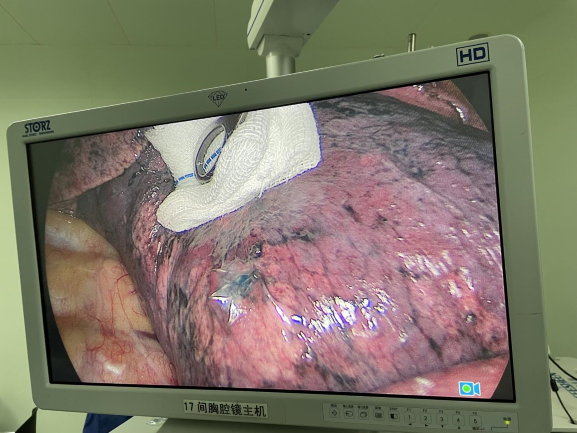 术中进镜顺利,增强现实光学导航系统实时匹配引导至右肺下叶后基底段,随后在规划好的位置释放H-Marker。释放后,手术团队依据标记物指引快速定位结节,遂行胸腔镜下肺楔形切除术,术后切除的标本可以清晰看到灰白色癌性结节已被精准切除,H-Marker位于结节边缘,定位精准。最终病理结果示:(右下肺结节)贴壁生长方式为主的腺癌,考虑贴壁型腺癌(LPA)。