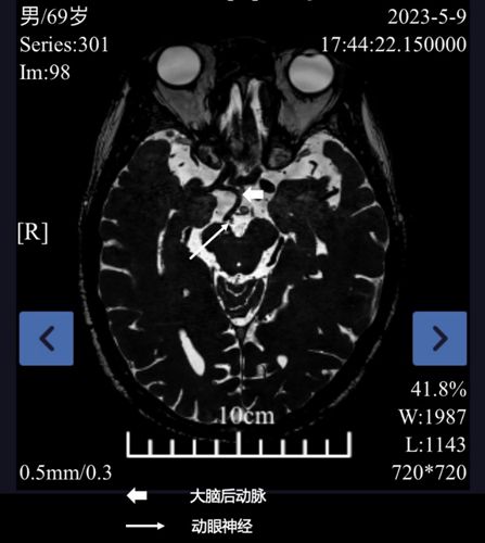 王知非教授接诊后,考虑患者可能是右侧动眼神经麻痹,但病因不明。收入院后,请影像科、眼科、神经内科等多学科会诊讨论。团队综合分析患者的病情后,为患者行颅脑薄层神经和血管扫描(着重追踪动眼神经),最终确定病因为:右侧动眼神经受到了走行异常的大脑后动脉压迫。