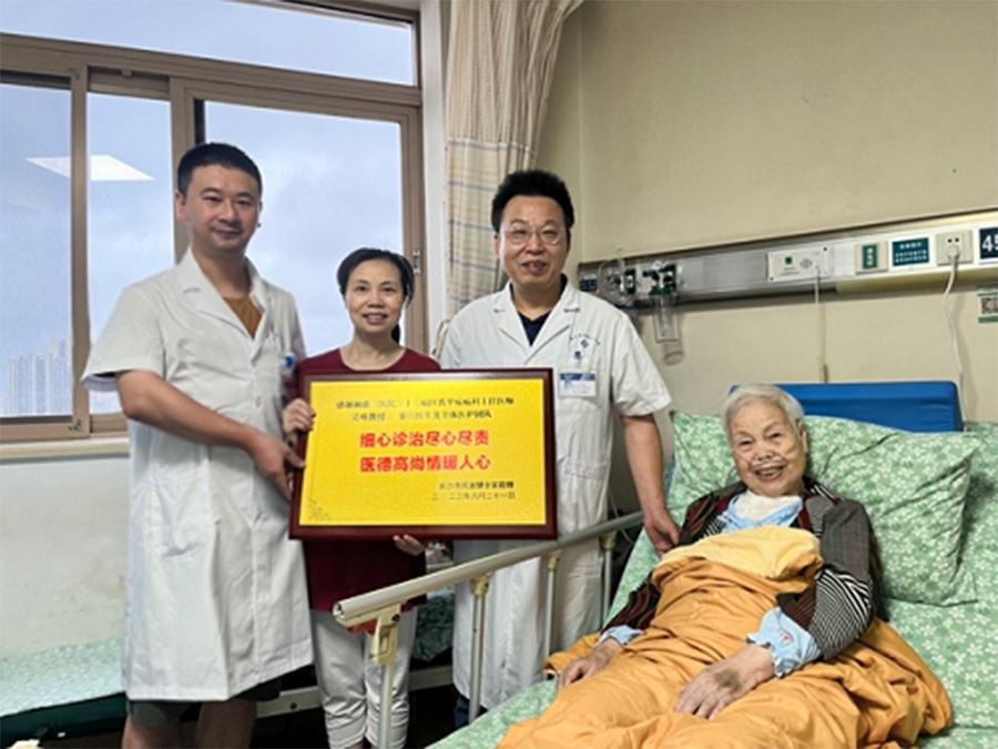 考虑到手术的迫切性,同时为减少下肢血栓脱落造成肺部栓塞风险。在取得患者家属知情同意后,6月14日下午,血管外科首先在局麻下施行了下肢静脉滤网置入术,并在6月15日上午8时,患者被准时推进手术室。因患者患有阿兹海默症,在进入陌生环境后,患者产生了焦虑躁动情绪,随即,手术室护士予以耐心轻柔的安抚,使患者情绪逐渐平稳。上午9时,麻醉科主任廖琴、李季教授、罗时超医师给患者施行了经鼻清醒插管,同时密切监测颅内供氧情况的变化。上午9:30,由吴唯教授主刀的手术正式开始,在约1小时后,患者右侧甲状腺终于被完整切除并取出。考虑到患者颈部气管长期压迫,存在气管塌陷风险可能,上午11:00患者带经鼻气管插管转入ICU留观。6月19日,患者脱管后病情稳定,由ICU转入普通病房,并于6月22日康复出院。